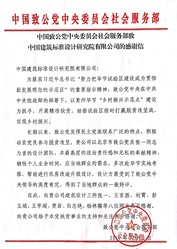 為積極落實(shí)中共中央打贏脫貧攻堅(jiān)戰(zhàn)的號(hào)召,標(biāo)準(zhǔn)院自發(fā)參與到貴州省畢節(jié)市七星關(guān)區(qū)的扶貧工作中來。2019年12月1日,在標(biāo)準(zhǔn)院建筑設(shè)計(jì)三所項(xiàng)目團(tuán)隊(duì)的共同努力下,標(biāo)準(zhǔn)院收到了中國致公黨中央委員會(huì)社會(huì)服務(wù)部發(fā)來的感謝信,感謝標(biāo)準(zhǔn)院和項(xiàng)目團(tuán)隊(duì)本著高度的政治責(zé)任感和無私的奉獻(xiàn)精神對(duì)于扶貧事業(yè)的支持和關(guān)注。