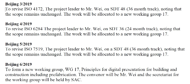Beijing 6/2019 :成立新的WG 17,包括裝配式的建筑工程數(shù)字化表達(dá)原則。召集人為魏來,秘書處由中國國家標(biāo)準(zhǔn)化管理委員會SAC承擔(dān)。