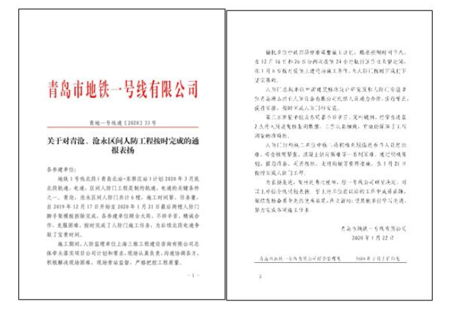 我院承建的青島地鐵1號線北段青滄、滄永區(qū)間人防工程是制約軌通、電通的關(guān)鍵條件,施工時(shí)間緊、任務(wù)重,我院青島地鐵項(xiàng)目部顧全大局、不辭辛苦,與相關(guān)單位精誠合作、克服困難、周密組織,按時(shí)完成了人防門施工任務(wù),為后續(xù)北段電通爭取了寶貴時(shí)間。為此青島市地鐵一號線有限公司對我院的工作進(jìn)行了高度肯定,并在全線進(jìn)行通報(bào)表揚(yáng)。此次工作進(jìn)一步鞏固我院在當(dāng)?shù)厝朔朗袌龅牧己每诒?
