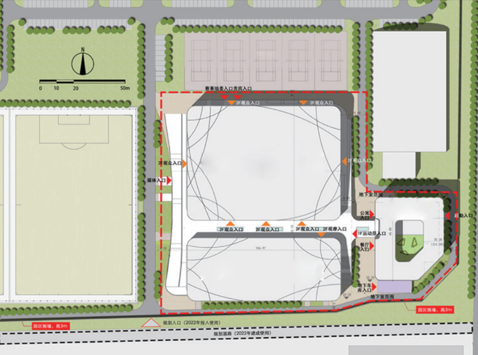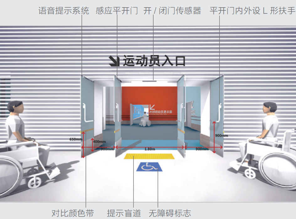 從場(chǎng)地規(guī)劃、空間布局、流線組織、設(shè)施設(shè)備、標(biāo)識(shí)系統(tǒng)、避險(xiǎn)避難六大體系開展設(shè)計(jì),總結(jié)出通用的無障礙設(shè)計(jì)策略,以及針對(duì)此體育場(chǎng)館特有的無障礙設(shè)計(jì)策略,為運(yùn)動(dòng)員的訓(xùn)練參賽、生活輔助等打造全面的人性化環(huán)境。