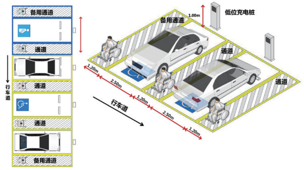 使用“N+1”停車位的設(shè)計(jì)理念,即N車位數(shù)+1通道數(shù),為不同停車方向下車的輪椅使用者提供方便。無障礙機(jī)動(dòng)車停車位為藍(lán)色,孕婦停車位為黃色,與普通車位區(qū)分,并涂有停車線、輪椅通道線和無障礙標(biāo)志,配有低位充電樁。