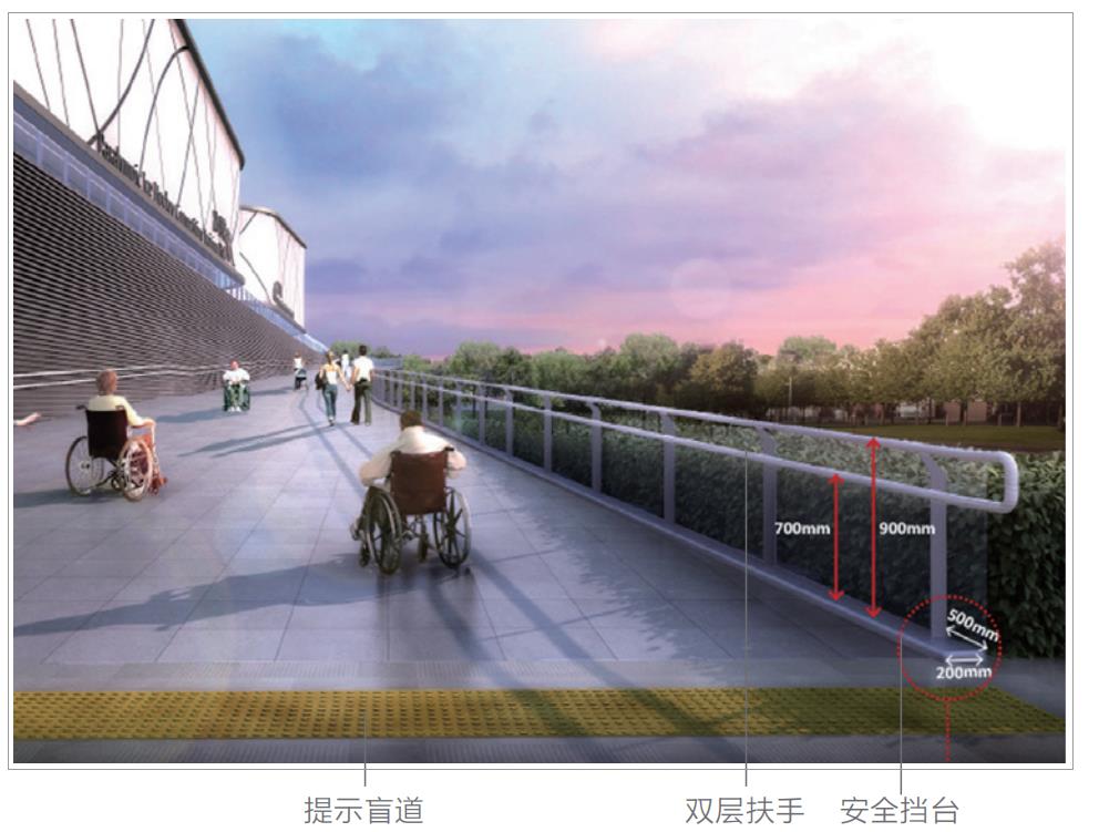 西側(cè)主坡道作為觀眾主入口,會(huì)有大量人群同時(shí)進(jìn)入,該坡道縱向坡度為1:20,輪椅使用者可自行上坡,無需他人幫助;并在坡道兩側(cè)設(shè)雙層扶手。上層高度為900mm,下層高度為700mm,可以同時(shí)滿足正常人與坐輪椅人的抓握高度需求。