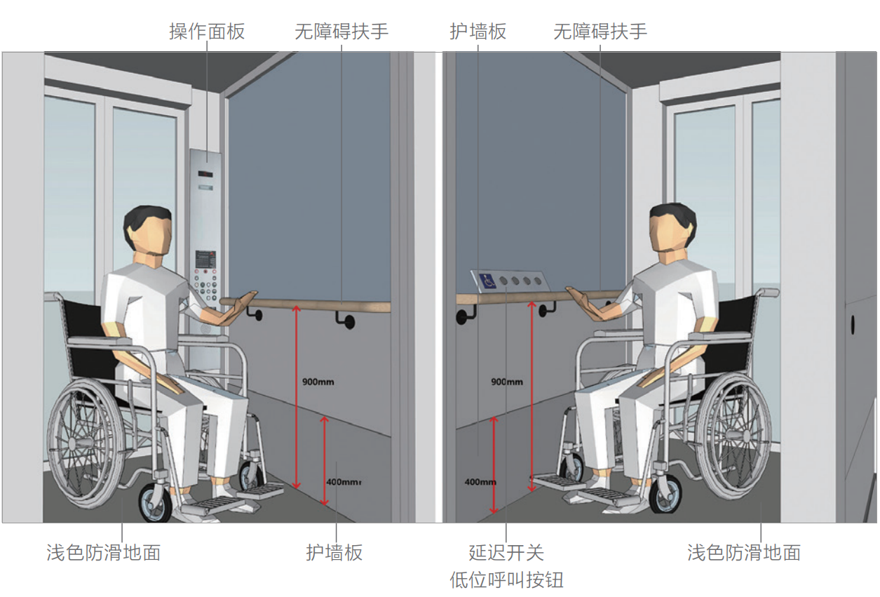 電梯門應(yīng)保持5~20s的開啟時(shí)間,除非使用者操作轎廂內(nèi)的轎門開關(guān)按鈕,確保人員安全通行時(shí)間。轎廂的三面壁上設(shè)高900mm扶手。轎廂內(nèi)部的設(shè)計(jì)與安裝要避免造成傷害,不存在尖角或凸出物。轎廂內(nèi)三面采用鏡面不銹鋼,可將轎廂環(huán)境盡收眼底。輪椅進(jìn)出時(shí),能通過鏡面觀察周圍情況,進(jìn)退自如。