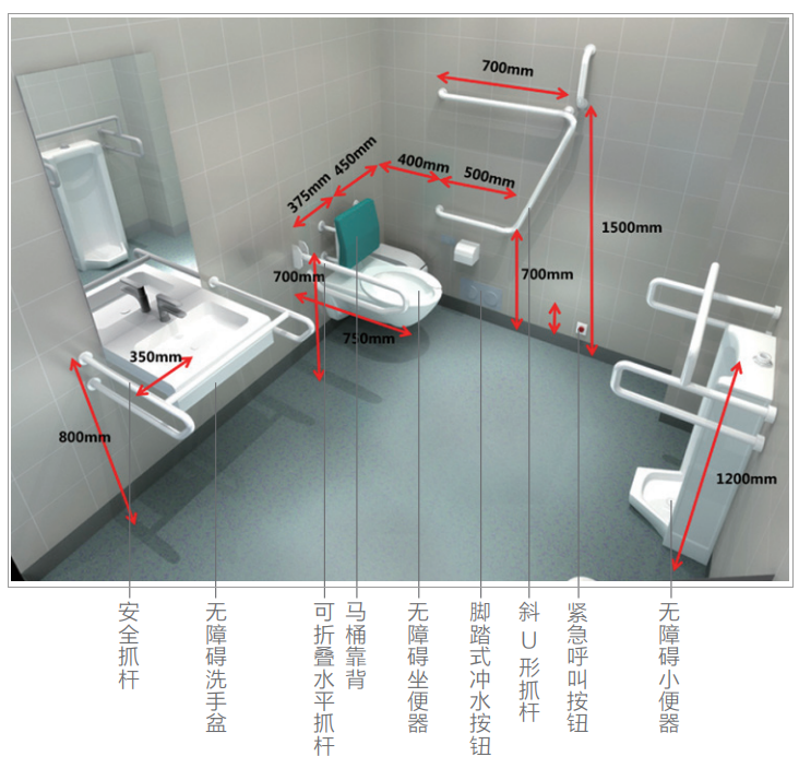 衛(wèi)生間入口無門檻,門旁邊設(shè)置低位開關(guān)按鈕。衛(wèi)生間內(nèi)包括無障礙坐便器、小便器、洗手盆、鏡子、取紙器、U形抓桿、可折疊水平抓桿、安全扶手、腳踏式按鈕、多功能臺(tái)、呼叫按鈕、掛衣鉤等設(shè)施,隔間內(nèi)部輪椅回轉(zhuǎn)直徑為1.50m。