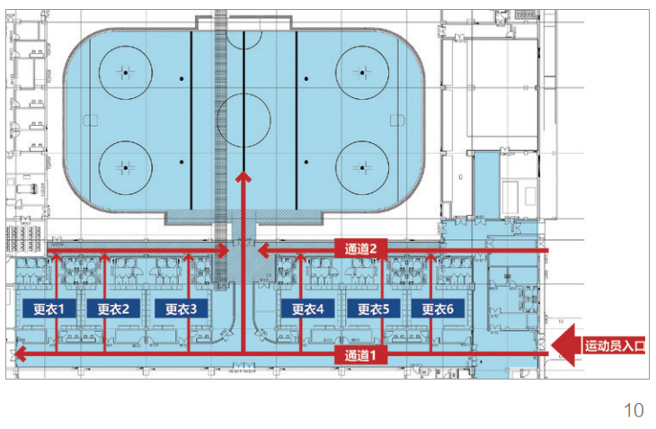 根據(jù)殘奧會(huì)冰球比賽的流程和運(yùn)動(dòng)特征,運(yùn)動(dòng)員需乘坐輪椅或使用義肢經(jīng)過鋪設(shè)有普通材質(zhì)地面的走廊到達(dá)更衣室,在更衣室內(nèi)更換冰橇后,前往檢錄處、場(chǎng)地和替補(bǔ)席,為了冰球運(yùn)動(dòng)員乘坐冰橇的通行順暢,此部分走廊需要鋪設(shè)仿真冰面,以便冰橇滑行。因此,在運(yùn)動(dòng)員更衣室前后設(shè)計(jì)雙側(cè)走廊。