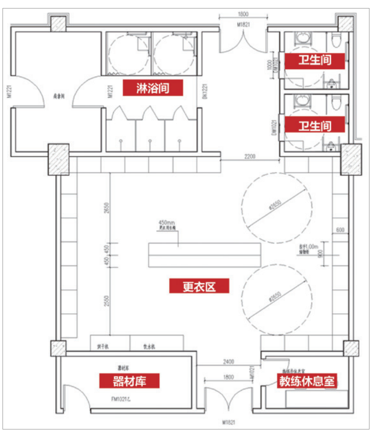 輪椅冰壺訓(xùn)練館無障礙運(yùn)動(dòng)員休息室每間包括更衣區(qū)、無障礙衛(wèi)生間(2個(gè)單間)、無障礙淋浴間(2個(gè)隔間)及清潔間;更衣區(qū)內(nèi)部設(shè)有直徑2.60m的輪椅回轉(zhuǎn)空間。