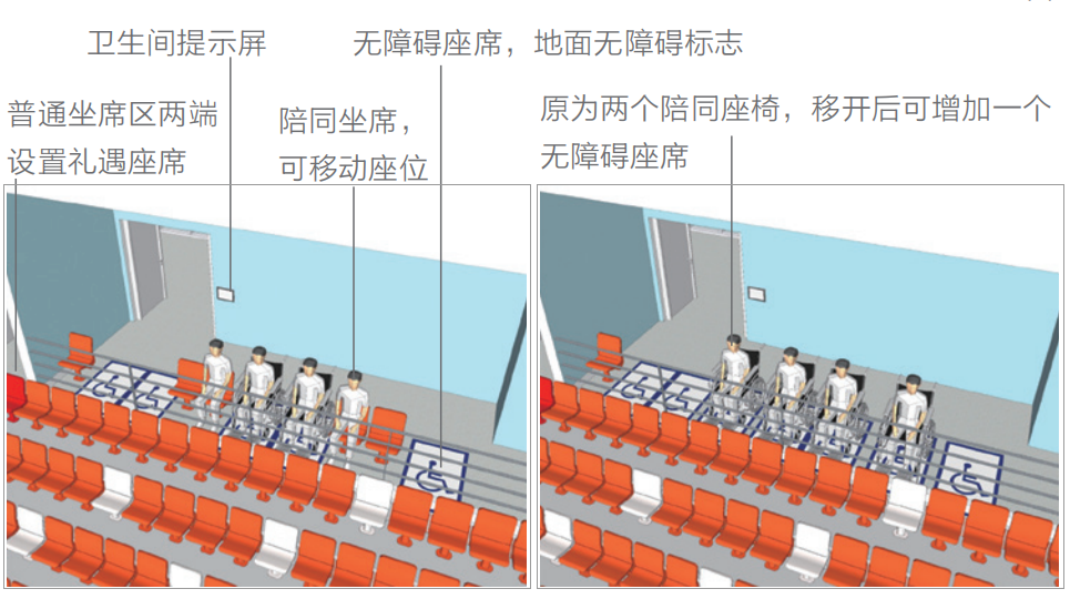陪同坐席使用可移動(dòng)座椅,不需要的時(shí)候可以移開,2個(gè)陪同坐席移開的寬度可以保證再加1個(gè)無障礙坐席,因此可根據(jù)現(xiàn)場(chǎng)人員使用情況靈活布置。