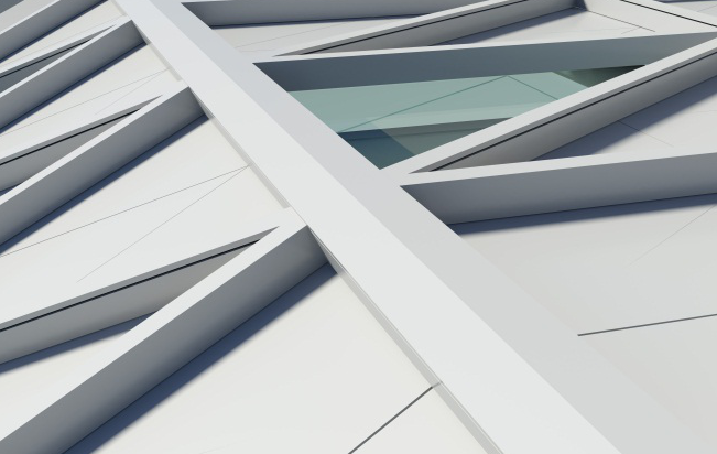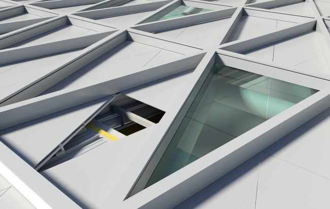 在方案深化階段,由于菱形分格較大,又增加了橫向分格線,建筑表皮形成了最終的三角形的分格。從圖中我們看到,表皮內(nèi)層采用直立鎖邊系統(tǒng),這層主要解決了表皮的排水問題,在直立鎖邊外做一層三角形檁條做為框架,在框架體系內(nèi)做鋁單板裝飾。這樣既解決了排水問題,又滿足了最初的表皮構(gòu)想。
