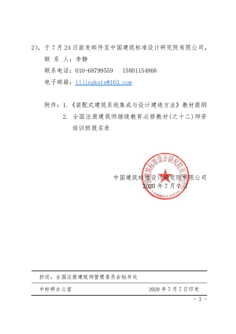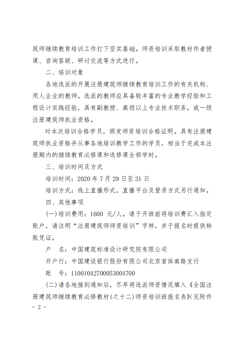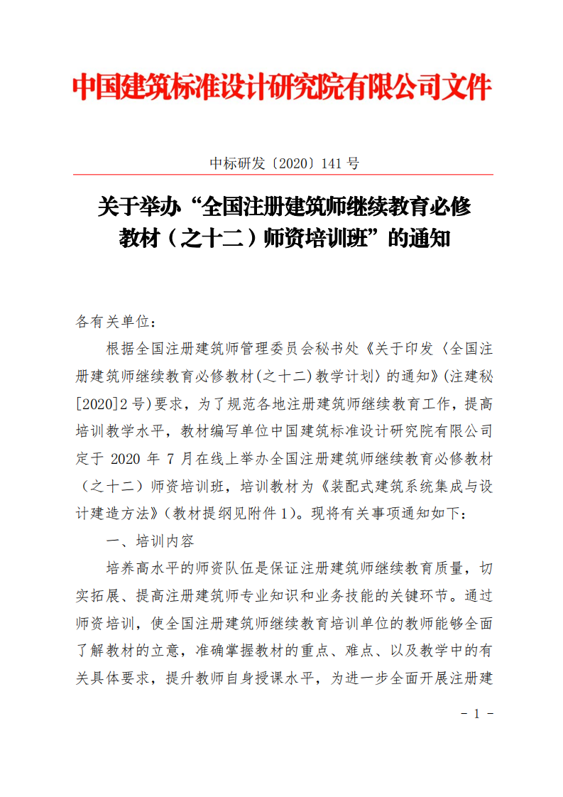 根據(jù)全國注冊建筑師管理委員會秘書處《關于印發(fā)〈全國注冊建筑師繼續(xù)教育必修教材(之十二)教學計劃〉的通知》(注建秘[2020]2號)要求,為了規(guī)范各地注冊建筑師繼續(xù)教育工作,提高培訓教學水平,教材編寫單位中國建筑標準設計研究院有限公司定于2020年7月在線上舉辦全國注冊建筑師繼續(xù)教育必修教材(之十二)師資培訓班(中標研發(fā)[2020]141號),培訓教材為《裝配式建筑系統(tǒng)集成與設計建造法》。師資培訓采取教材作者授課、咨詢答疑、研討交流等方式進行。