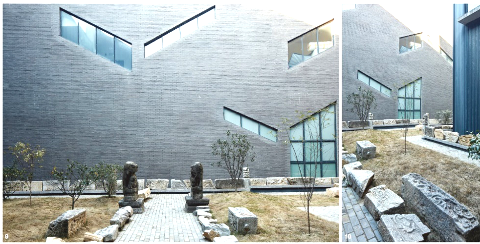 博物館和圖書館建筑立面上既有呈矩陣排列的方形窗,也有活潑跳躍的異形窗,每一個窗戶都嘗試著對其內(nèi)部空間在視覺上的詮釋和延展。從走廊里看上去上下飛騰的斜條窗,活力十足;而從庭院里看去它們又好像民居在城垣上的印記,古樸滄桑。