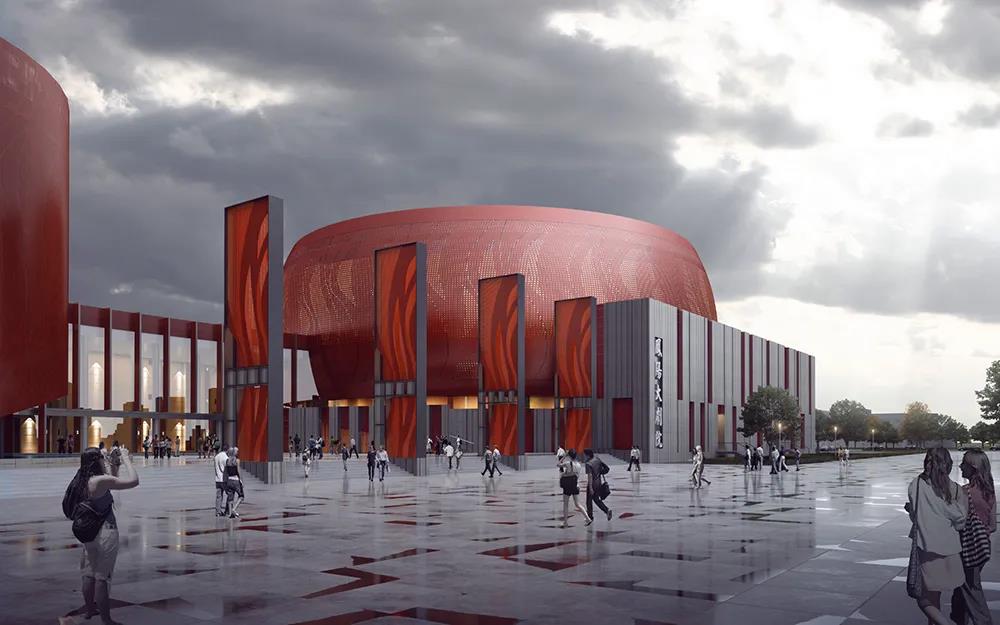 我們將大劇院的外形設(shè)計成長方形盒子,而將觀眾廳和舞臺部分布置在一個巨大的紅色的“花鼓”之中。灰色的“城墻”,紅色的“花鼓”,將鳳陽最具形象魅力的元素組合在一起,營造出獨具特色的建筑形態(tài)。
