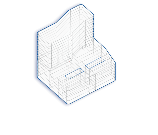 裙房中部設(shè)置醫(yī)療主街,東西布置模塊化醫(yī)療單元,單元之間嵌入庭院;東南角布置急診模塊;北側(cè)布置醫(yī)技模塊;南側(cè)布置門(mén)診模塊;上部布置護(hù)理單元模塊;護(hù)理單元模塊與醫(yī)技模塊間布置設(shè)備層。
