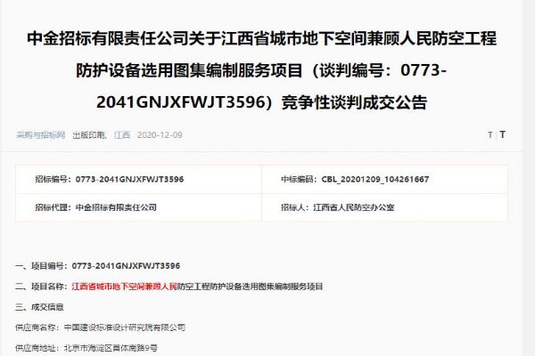 近日,中國建筑標準設計研究院(以下簡稱“標準院”)成功中標《江西省城市地下空間兼顧人民防空工程防護設備選用圖集》編制服務項目,該圖集項目為江西省人防行政主管部門重點推進工作之一。