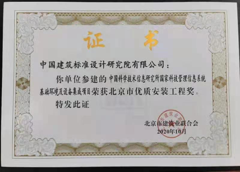 近日,由中國建筑標(biāo)準(zhǔn)設(shè)計(jì)研究院(以下簡稱“標(biāo)準(zhǔn)院”)參建的中國科學(xué)技術(shù)信息研究所國家科技管理系統(tǒng)基礎(chǔ)環(huán)境及設(shè)備集成項(xiàng)目,榮獲“北京市優(yōu)質(zhì)安裝工程獎(jiǎng)”。