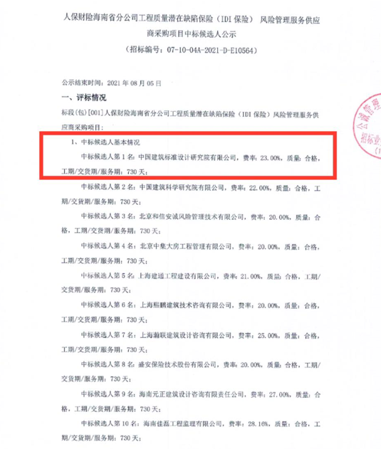 2021年8月5日,人保財險海南省分公司IDI保險的風(fēng)險管理服務(wù)商采購項目中標(biāo)候選人結(jié)果正式公布,標(biāo)準(zhǔn)院建筑產(chǎn)品應(yīng)用技術(shù)研究院在該采購項目所有中標(biāo)候選人中名列第一名!
