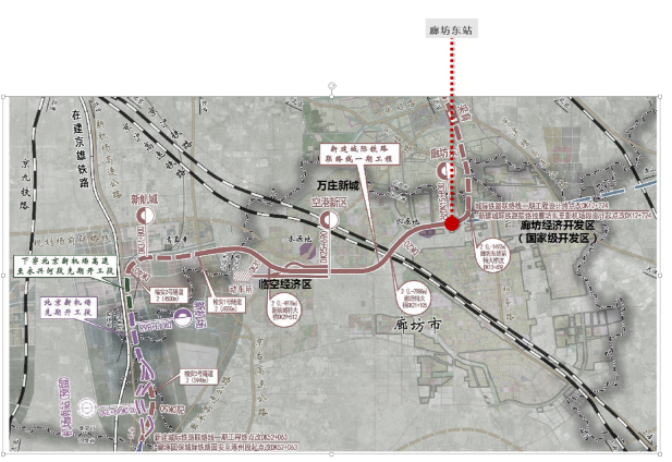 京廊城際產(chǎn)業(yè)園項(xiàng)目分為北區(qū)、南區(qū)兩個(gè)標(biāo)段,圍繞廊坊東站車站建設(shè)。其位于河北省廊坊市境內(nèi),緊鄰新建城際鐵路聯(lián)絡(luò)線一期工程的廊坊東站車站。高鐵線一期工程線路總長(zhǎng)39.7km,共設(shè)4座車站,分別為廊坊東站、空港新區(qū)站、新航城站、新機(jī)場(chǎng)站。未來二期工程進(jìn)一步延伸至首都機(jī)場(chǎng)T3航站樓。