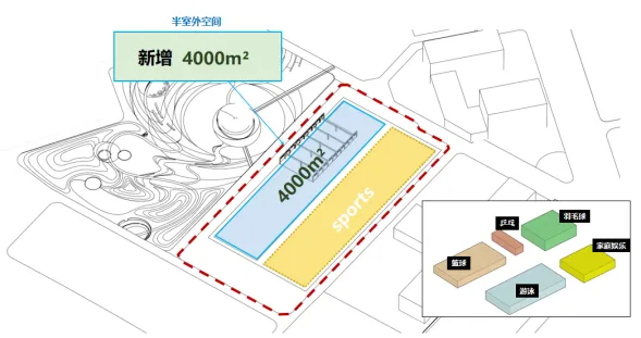 其中,3號樓項目策劃伊始,運營、策劃、建設及設計團隊便形成多維一體的綜合推進小組。策劃之初即形成了以下各大功能板塊,1.2萬平米的建筑面積功能包括:1500平米運動夢工場、4000平米泳池(1個標準泳池、一個25米訓練池)、2000平米籃球館(3片CBA全場)、1500平米羽毛球館(10片場地)以及運動康復館;同時,室外區(qū)域規(guī)劃7人制足球/飛盤場一個,標準網(wǎng)球場2個,以及兒童公園等內(nèi)容。