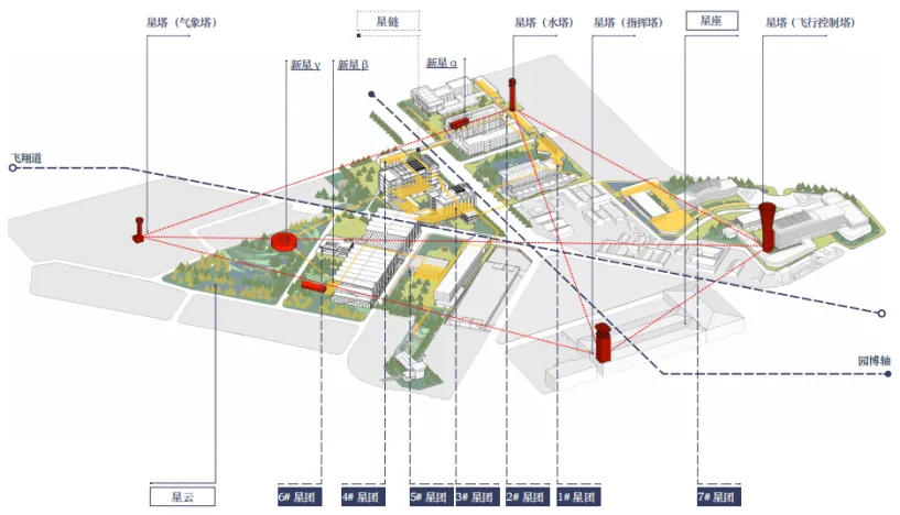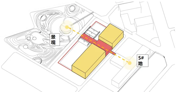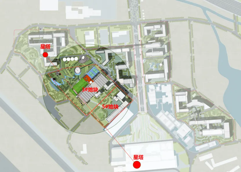 “冠軍一號”3號樓滿足運營并最大化節(jié)地,利用既有建筑作為室外平臺,與北側公園有機聯(lián)系,打造小鎮(zhèn)健康生活綜合體;以星空體育公園為核心的景觀空間系統(tǒng),營造具有活力的公共體驗。