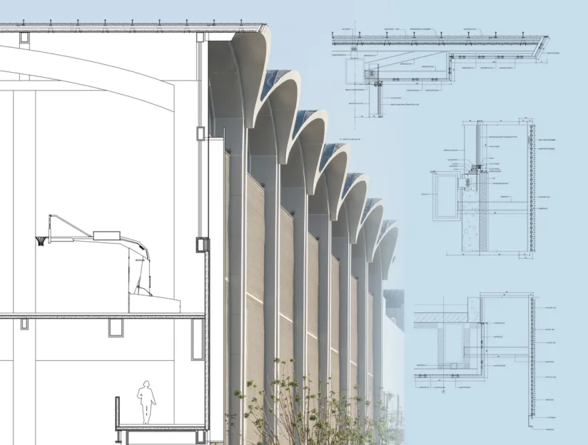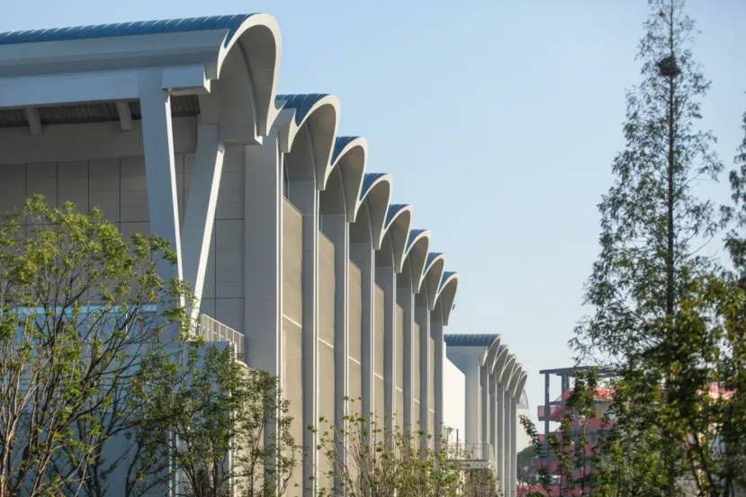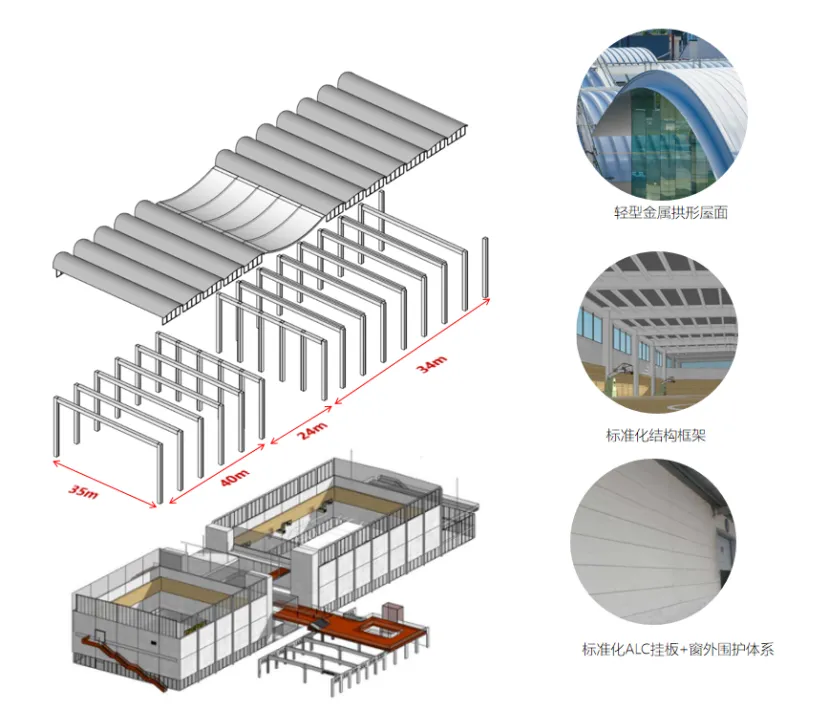 項目自設計到竣工落地僅一年時間,在此過程中,裝配式應用效能顯著。輕型金屬拱形屋面的運用,不僅結構穩(wěn)固、承載力強,而且安裝快捷、易于維護,有效降低了建筑整體重量,同時賦予了建筑獨特的視覺美感。