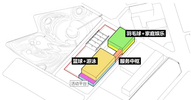 同時,梯次退臺的設計還賦予了建筑更多元化的使用可能,可以因地制宜地設置觀景平臺、戶外休閑區(qū)等公共空間,讓建筑在滿足全民健身需求的同時,也成為一個能夠?qū)υ挌v史、連接社區(qū)的開放性城市節(jié)點。