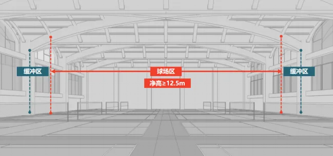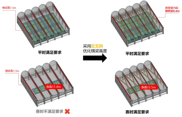 體育空間的立體化設計對建筑高度提出了新的挑戰(zhàn),尤其在面對用地規(guī)劃20米限高規(guī)定以及室內(nèi)體育場地特定的凈高需求。以羽毛球館為例,訓練和比賽場地要求為12.5米凈高,傳統(tǒng)拱形結構設計因橫梁高度限制,在實際應用中難以滿足賽時的凈空高度標準。為解決這一問題,設計創(chuàng)造性采用了交叉拱的結構形式,通過受力分布的改變,成功將橫梁高度由原來的1.5米大幅縮減至0.4米,不僅確保了日常訓練與正式比賽的凈空高度要求,而且有效降低了整體建筑高度,使之符合用地規(guī)劃的限高標準。這種優(yōu)化設計實現(xiàn)了室內(nèi)空間的高效利用,充分體現(xiàn)設計與功能需求、規(guī)劃要求之間的和諧統(tǒng)一。