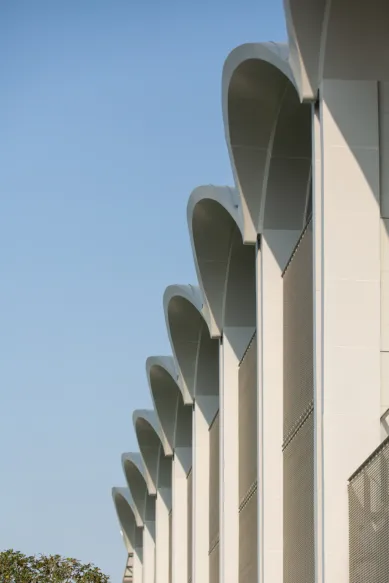 設計采用拱形單元結構,將大體量體育功能化整為零,較大尺度的體育空間以較小尺度的外立面呈現(xiàn),形成一定的節(jié)奏韻律。建筑在滿足基本使用需求的同時,能夠更好地融入周邊環(huán)境,使建筑與園博園整體空間和諧共生。