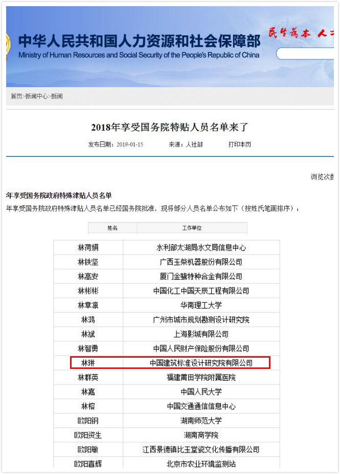 近日,人社部發(fā)布了《人力資源社會(huì)保障部關(guān)于公布2018年享受政府特殊津貼人員名單的通知》(人社部發(fā)﹝2019﹞11號(hào)),經(jīng)國務(wù)院批準(zhǔn),中國建筑標(biāo)準(zhǔn)設(shè)計(jì)研究院副總建筑師林琳入選2018年度享受 ...