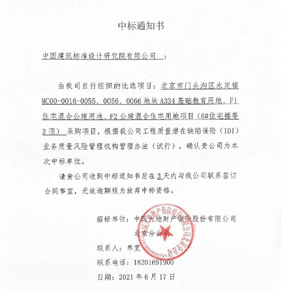 2021年6月17日,中國(guó)大地財(cái)產(chǎn)保險(xiǎn)股份有限公司北京分公司的風(fēng)險(xiǎn)管理服務(wù)商中標(biāo)結(jié)果正式公布,標(biāo)準(zhǔn)院建筑產(chǎn)品應(yīng)用技術(shù)研究院成功中標(biāo)“北京市門頭溝區(qū)永定鎮(zhèn)MC00-0016-0055、0056、0066地塊A3 ...